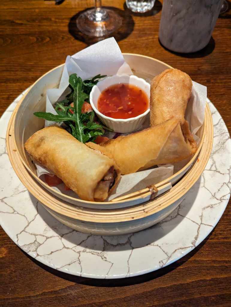 We chose starters from the weekly market menu, including the vegetable spring rolls which were served on a bamboo plate with a side of salad and sweet chilli sauce. We also had the duck liver and orange pate, which tasted delicious and creamy, but it was served with regular toast instead of sourdough, which was included in the product description on the menu.