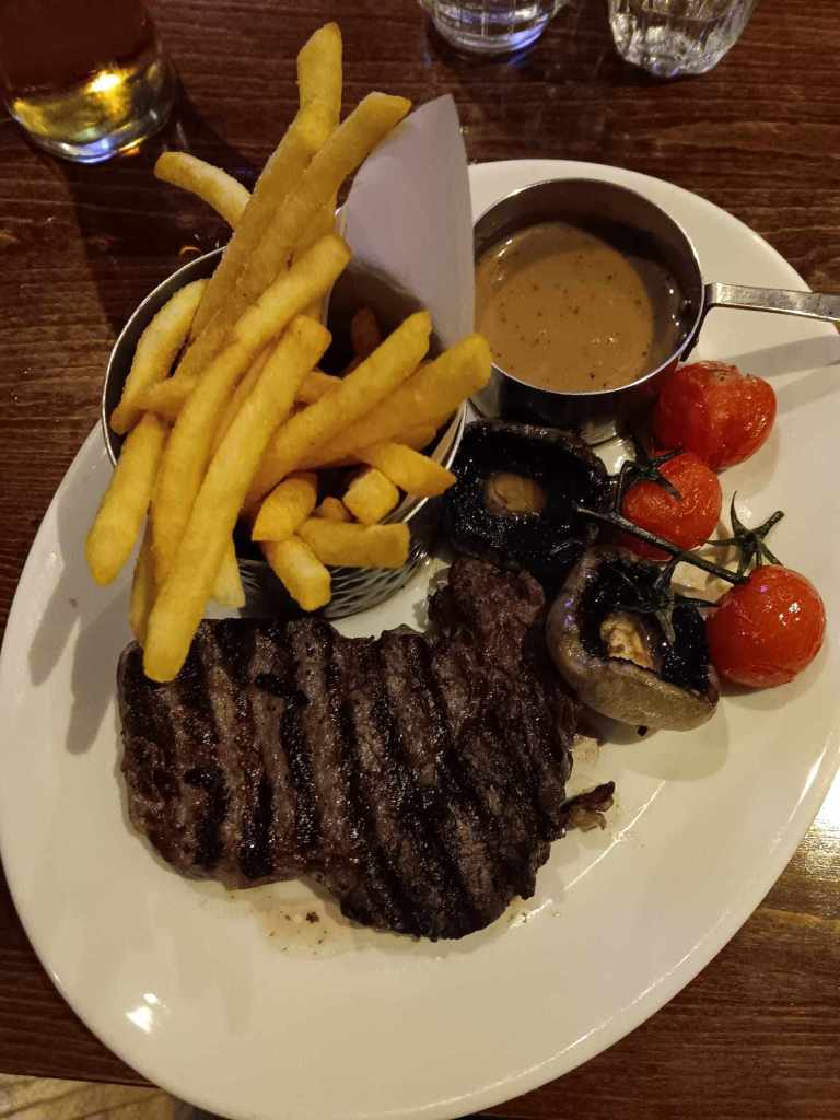 All the mains were ordered from the weekly market menu apart from one: The medium ribeye steak with peppercorn sauce and chips cost £27 from the à la carte menu. The steak tasted perfect, but the sauce was a tad on the sweet side.